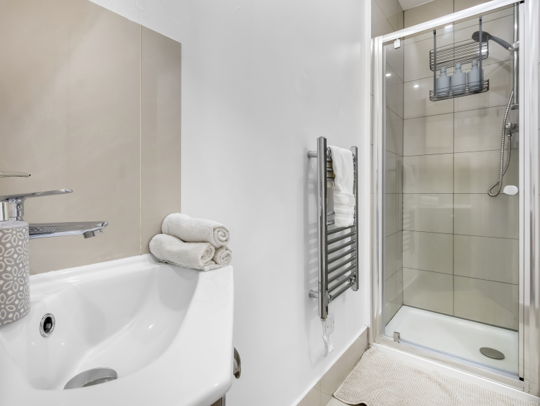 The bedroom is generously sized, with a king size bed and built in wardrobes offering plenty of storage space for longer stays.