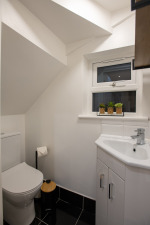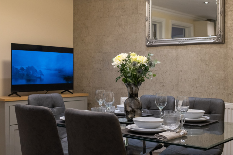 A fully equipped kitchen with oven, hob, fridge/freezer, microwave, dishwasher and washing machine as well as a dining area ideal for meals or remote working. The apartment has a modern bathroom and toilet. There is also an extra and separate W/C for additional convenience. Essentials such as toilet roll, kitchen roll and cleaning products are provided, along with fast WiFi throughout. Ironing facilities are also available for all guests and located in the communal areas for everyone to use.