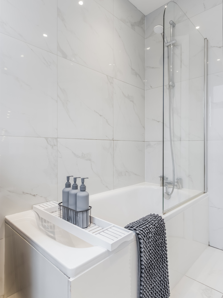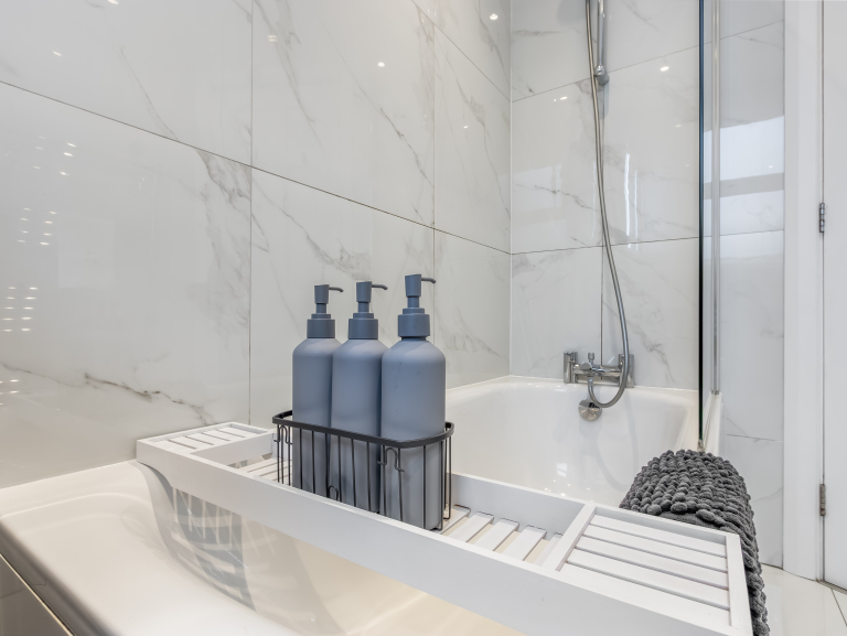 The bathroom features a bath tub/ shower, toilet and complimentary toiletries including shower gel, shampoo, and conditioner. Essential supplies such as toilet roll, kitchen roll, and cleaning basics are thoughtfully stocked to ensure a hassle free stay.
